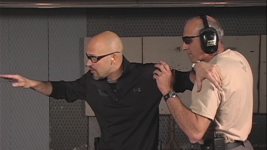 Technical aspects of shooting a handgun: trigger control, dynamic deviation control, two-handed firing grip, and 360-degree presentation from the holster.